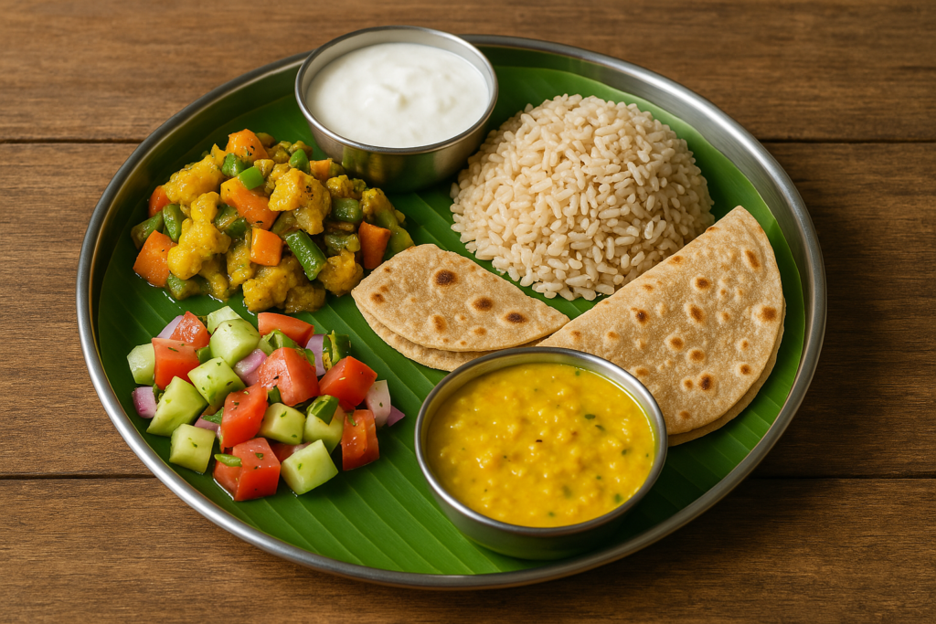 - ब्राउन राइस या मल्टीग्रेन रोटी।